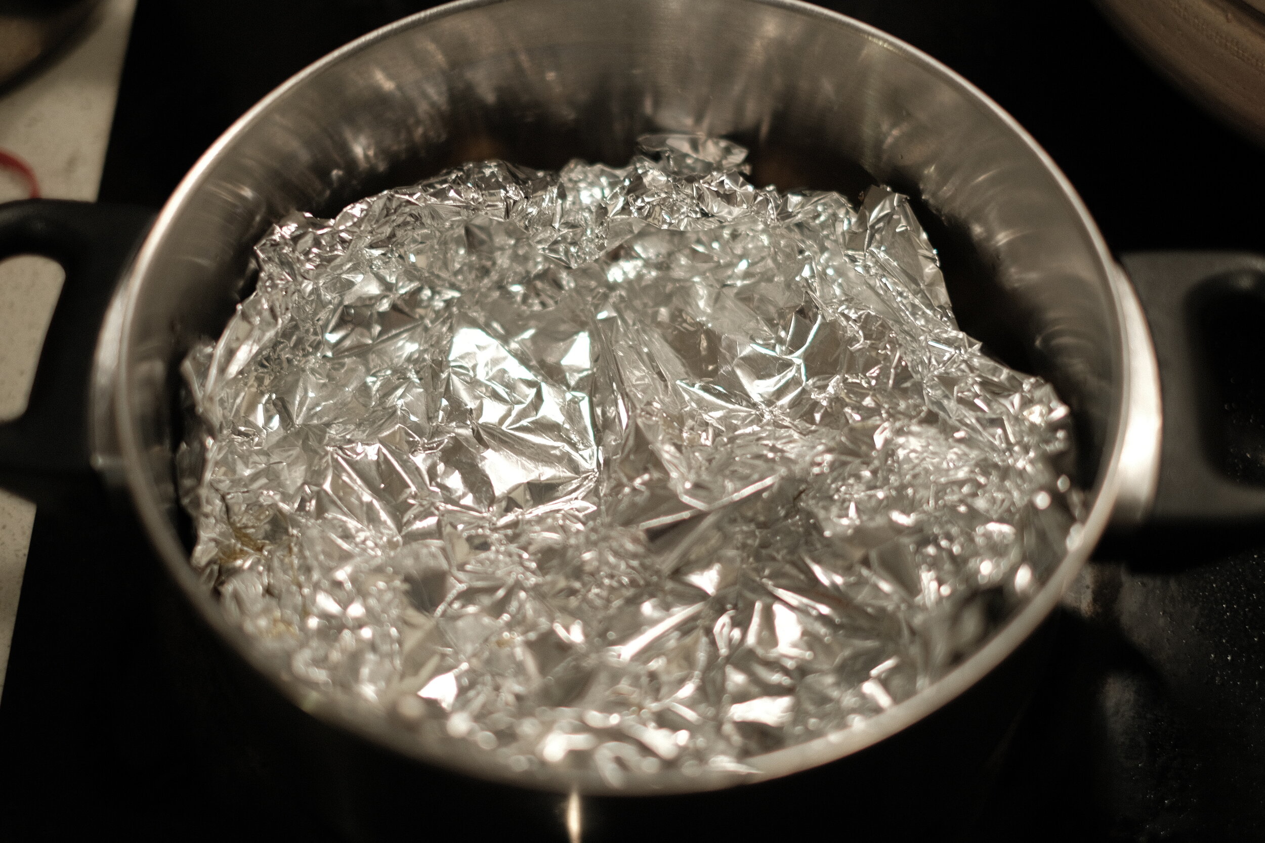5. Put all aburaage seasonings and aburaage in the pot. Heat it on low medium heat, drop a piece of aluminum foil directly on top to cover it entirely, and then boil it down for 10 minutes. Leave to cool.